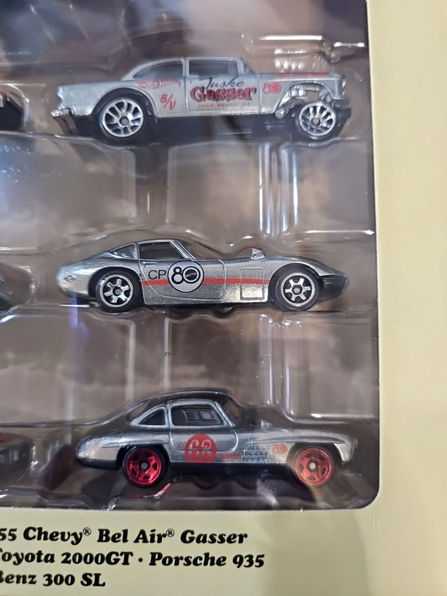 En 2025, pour les 80 ans de Mattel, 7 voitures de sport sortent avec une teinte argentée, c'est la série Replay The Classics.