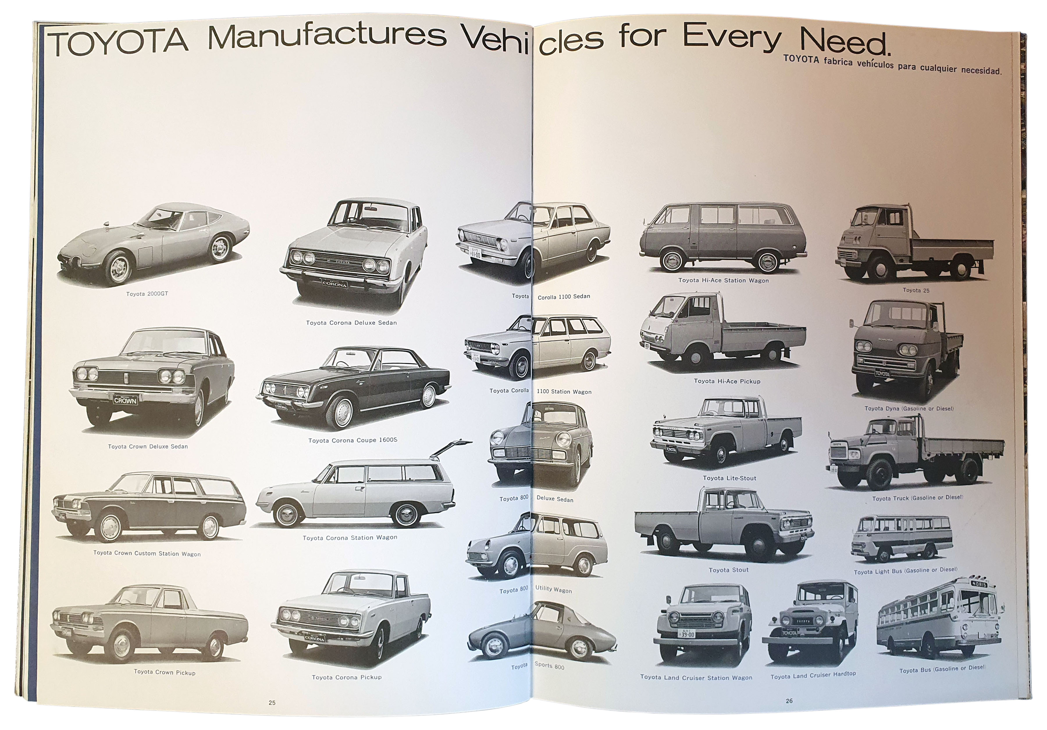 Catalogue général Toyota en anglais et espagnol avec la 2000GT. Environ 20 pages. La gamme présentée correspond au marché japonais.