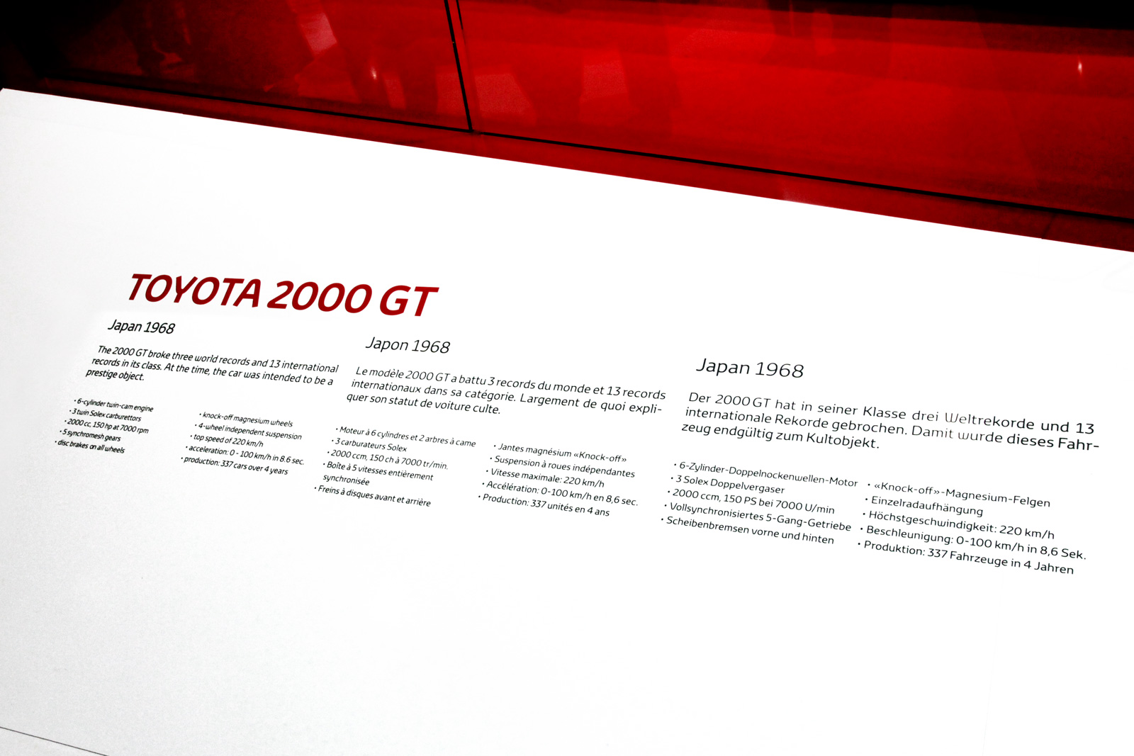 Pour la présentation de la nouvelle GT86, une 2000GT est exposée au Salon de l'Automobile de Genève, en mars 2012. Cette voiture est immatriculée en Belgique et était présente au Schloss Dyck en 2010 et aussi à l'Autoworld 2013. C'est un magnifique exemplaire très bien restauré. |