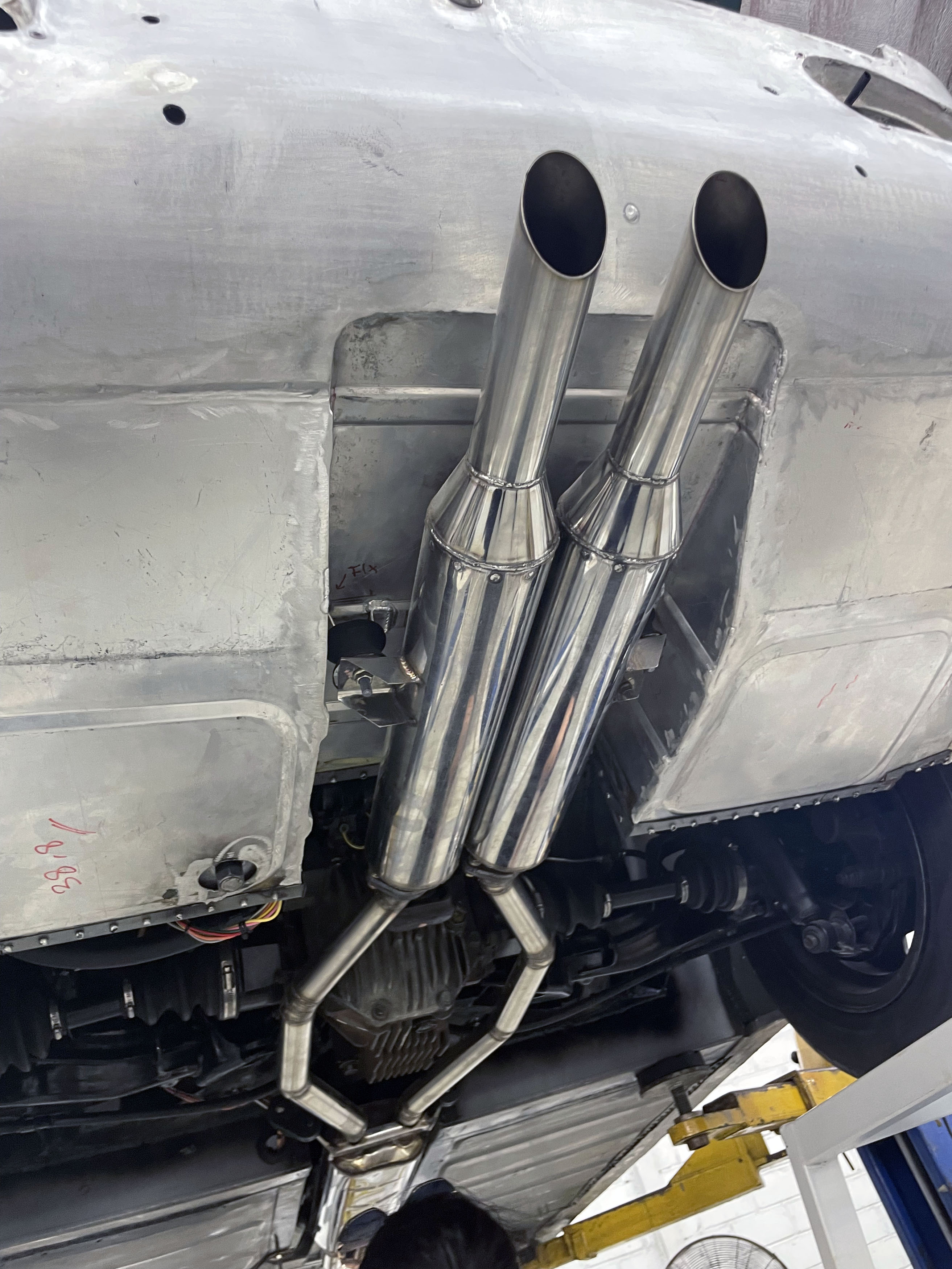La carrosserie est entièrement façonnée à la main, en aluminium. Les tôles sont formées sur un gabarit en bois recréé, comme à l’origine. Chaque pièce de la voiture est refabriquée dans l’atelier sur des plans réalisés par le studio. Les pièces ne sont pas compatibles avec la voiture originale.